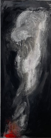 Bij Kees de Vries zuigen de draaiende bewegingen in de verf, die vanuit elke hoek een andere glans krijgen, in eerste instantie je blik de diepte in van het blauw. Maar blauw geeft in dit schilderij geen rust, geen houvast. Je blik verliest zich in de diepte van het zwarte vlak en ontdekt daar dat zwart is opgebouwd uit een brede schakeringen van donkere kleuren.